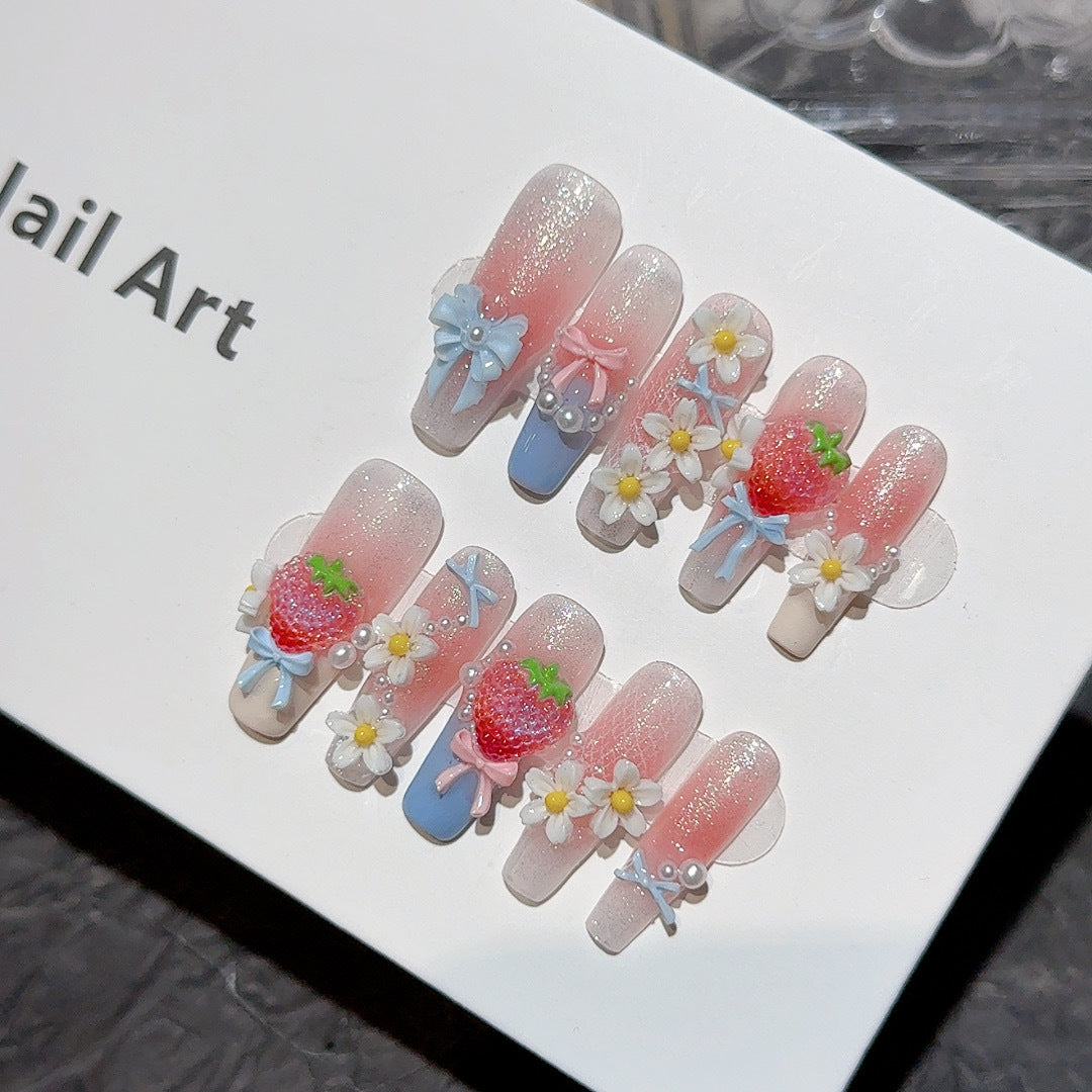 Strawberry Garden Shimmery Sweet Must-Have Handmade Press-On Nails, Summer Sweet Strawberry Design, Nail Tips
